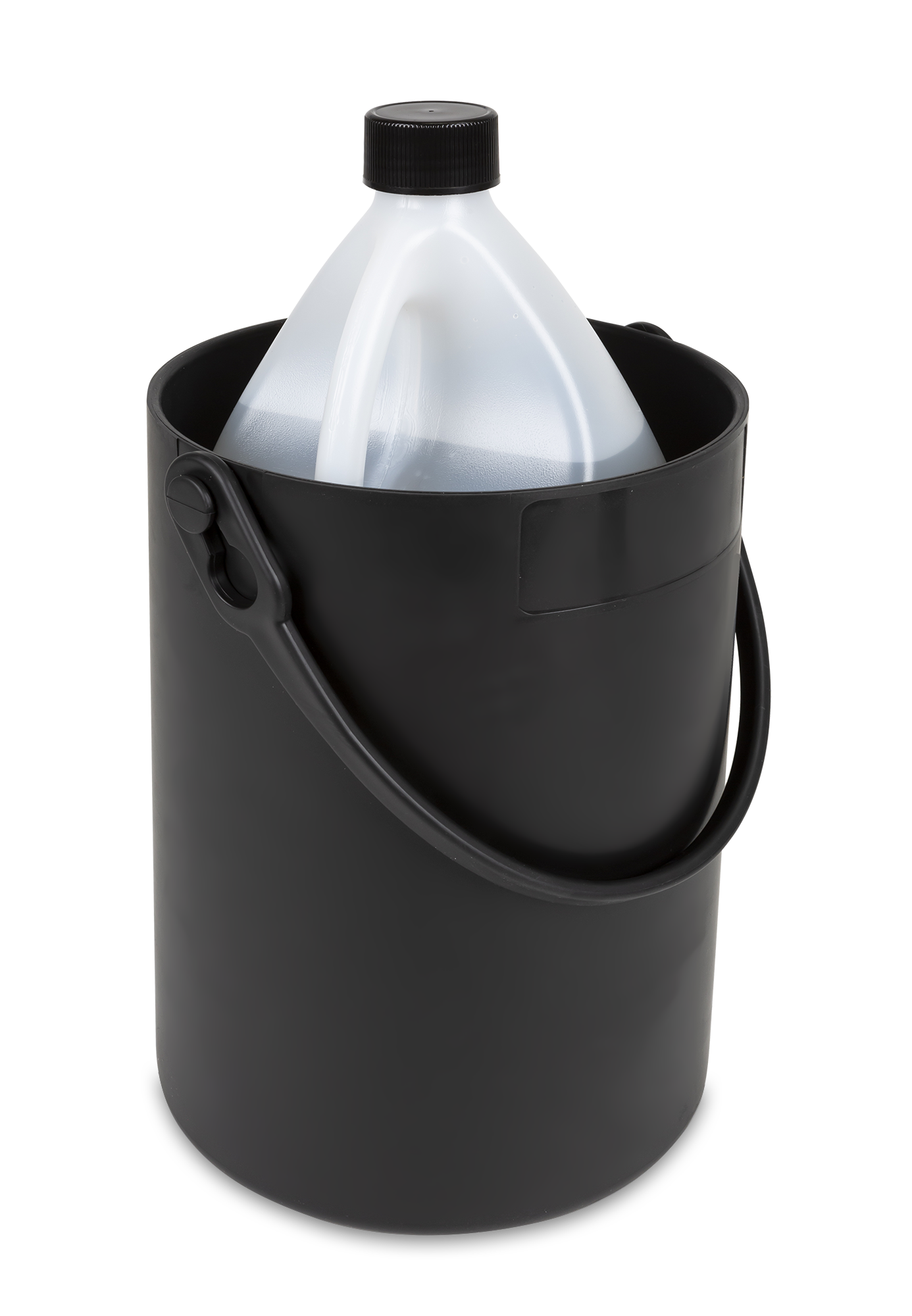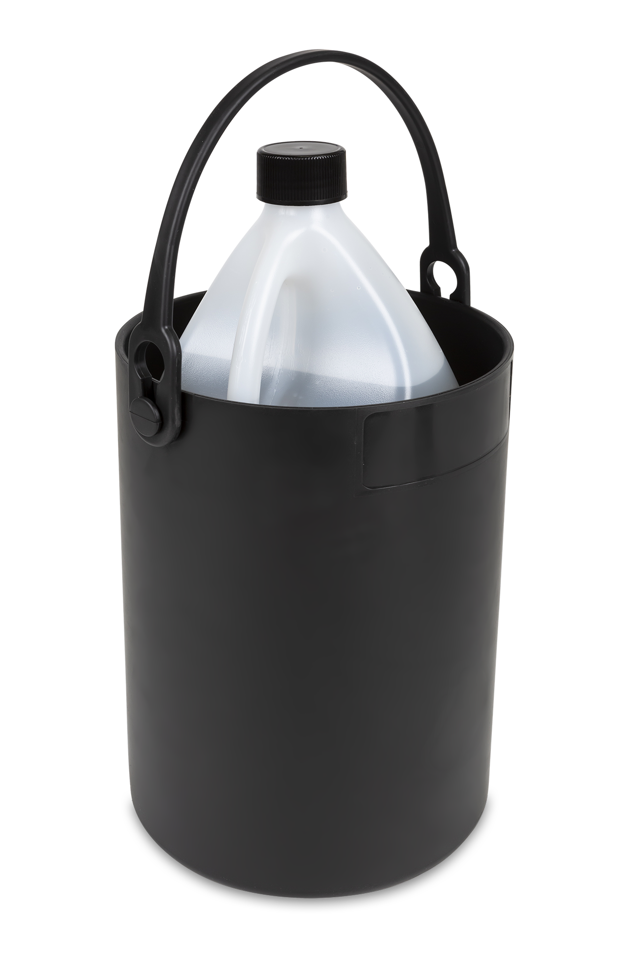 Ensure secure bottle transport with the Safety Bottle Carrier 4.5L in black. This chemical-resistant, flexible plastic carrier is designed for 4.5-liter bottles. It's autoclavable and dishwasher-safe, with an ergonomic handle for comfort. The handle moves for easy access, while the centering ring and recessed marking area provide stability and convenience during transport or storage.